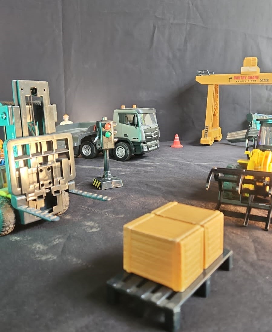 No chão, a reconstrução do trânsito interno de uma empresa/indústria, onde réplicas de equipamentos reais realizarão atividades do dia a dia de uma operação.